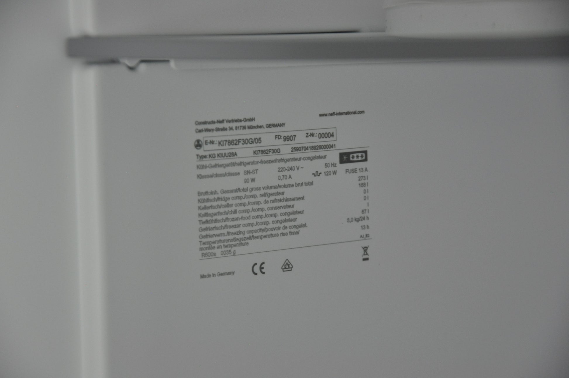 Neff Ki7862F30G full height 60/40 split fridge freezer left-opening